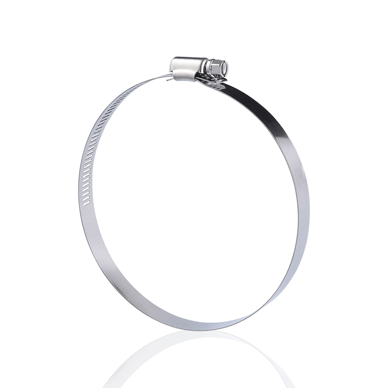 Valmistettu korkealaatuisesta ruostumattomasta teräksestä ja sillä on erinomaiset ruosteenesto- ja korroosionestoominaisuudet. Vaikka sitä käytettäisiin pitkään ankarissa ympäristöissä, kuten kosteudessa, hapossa ja emäksissä, se voi pitää pinnan tasaisena, estää tehokkaasti ruostetta ja vaurioita ja pidentää käyttöikää. Läpireiän leimausprosessin kautta teräshihnan puruura on ontto, mikä ei ainoastaan vähennä kokonaispainoa, vaan mahdollistaa myös ruuvin hampaiden upottamisen tiukasti uraan. Tämä rakenne tarjoaa vahvemman puremisvoiman lukituksen yhteydessä, mikä varmistaa liitoksen lujuuden ja tiiviyden.